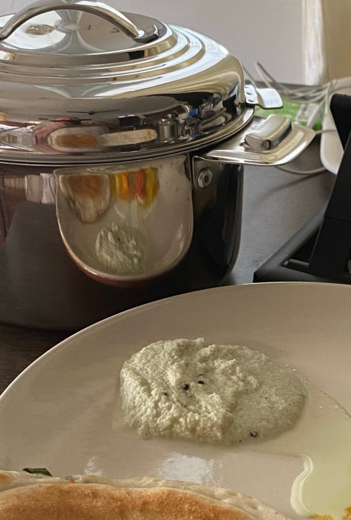 Petit déjeuner; pancakes de farine de riz, curry de légumes et chutney fait à partir de noix coco, le tout arrosé d’un thé au lait, premier délice du jour